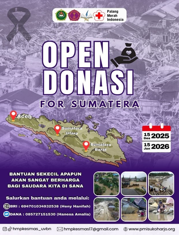 Kegiatan Penggalangan Dana untuk membantu saudara-saudara kita yang menjadi Korban Bencana Alam di Sumatera, dilaksanakan pada 15 Desember 2025 hingga 15 Januari 2026. Penggalangan dana ini dilakukan secara online dan offline di beberapa lokasi, seperti CFD Sukoharjo, CFD Solo Baru, CFD Slamet Riyadi, serta di area dalam dan luar kampus Universitas Veteran Bangun Nusantara. Kegiatan ini merupakan bentuk kepedulian sosial yang bekerja sama dengan PMI Sukoharjo untuk memastikan donasi tersalurkan dengan tepat sasaran. Penggalangan dana dimulai dengan penyebaran pamflet open donasi melalui media sosial agar dapat menjangkau masyarakat luas. Penggalangan dana ini di laksanakan pada hari Senin 15 Desember 2025 sampai dengan hari Kamis 15 Januari 2026. Total dari hasil penggalangan dana memperoleh uang sejumlah Rp 4.882.000.